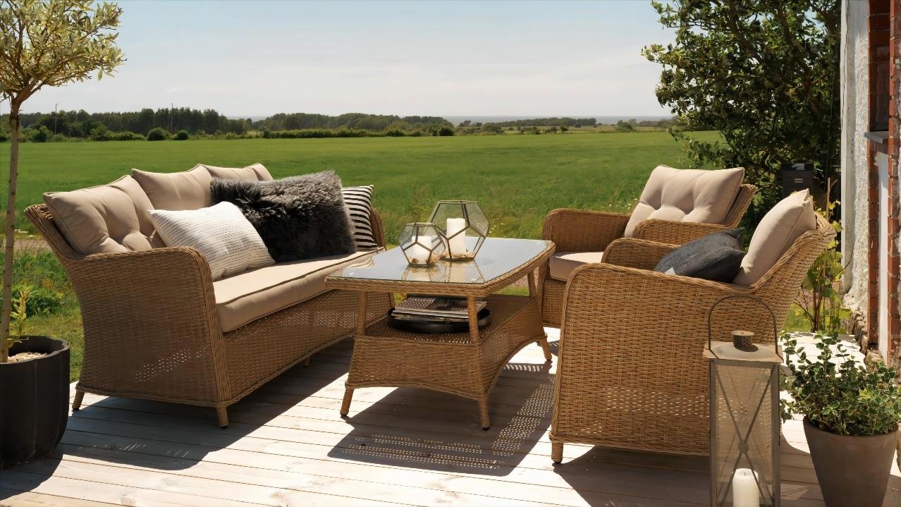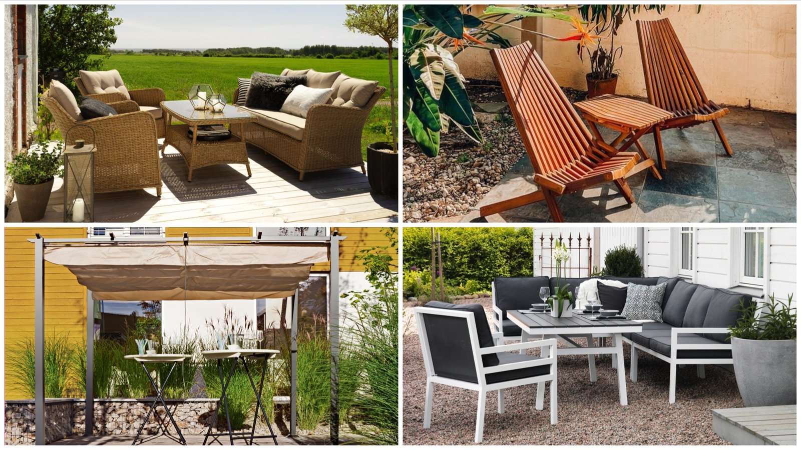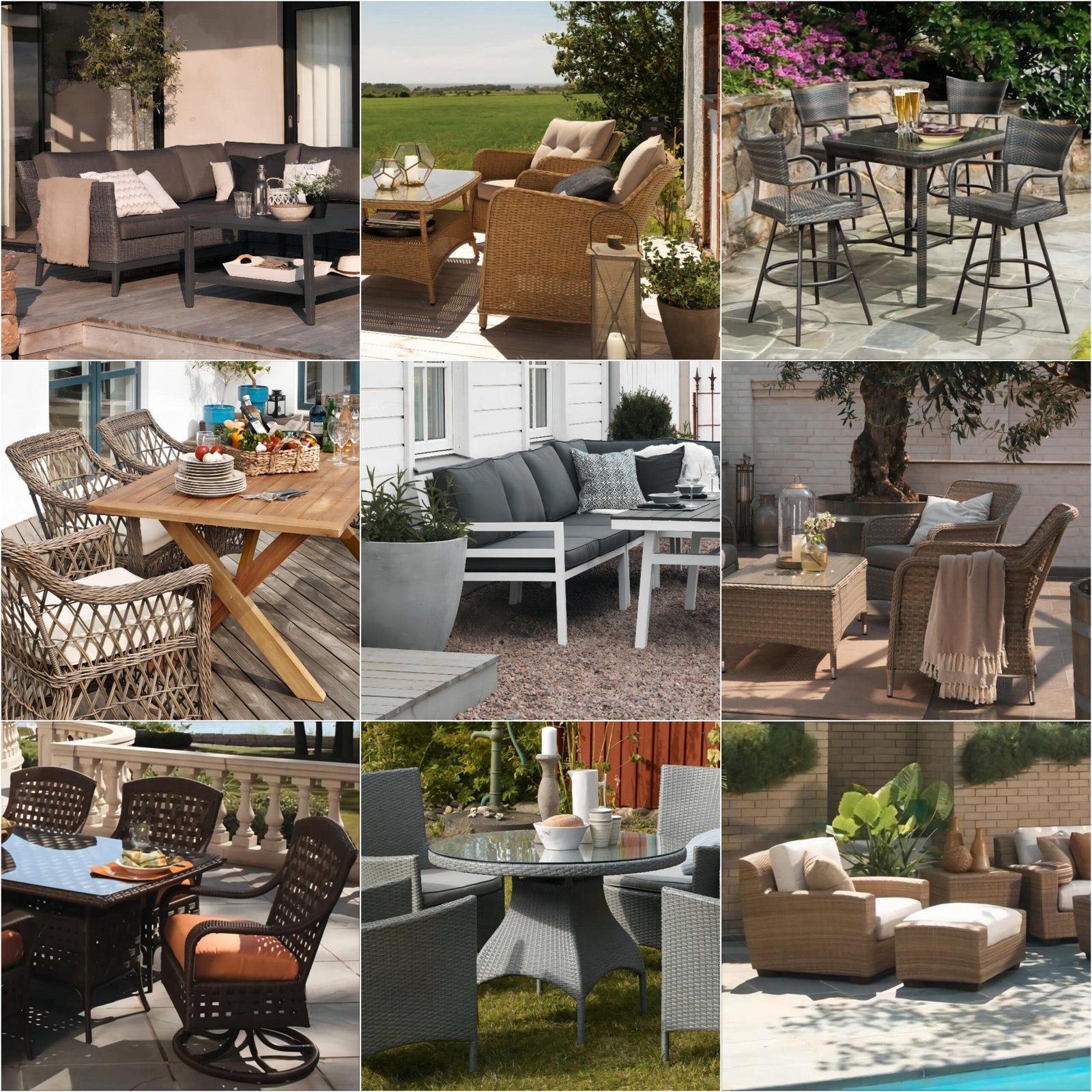 Includes wood, metal, wicker, and mixed-material outdoor furniture for patio, garden, and commercial outdoor spaces.